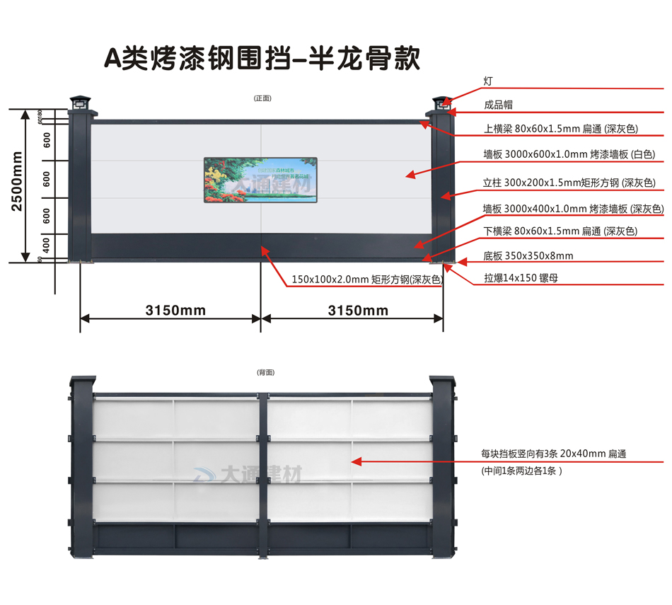 深圳市大通建材有限公司A類烤漆鋼圍擋-半龍骨款廠家直銷,美觀大氣、穩(wěn)固耐用;適用于深圳圍擋市政建設(shè)施工、房地產(chǎn)項(xiàng)目施工、地鐵項(xiàng)目施工、管網(wǎng)改造等工程,為很多項(xiàng)目施工工程提供圍擋批發(fā)、圍擋安裝及圍擋廣告業(yè)務(wù)。