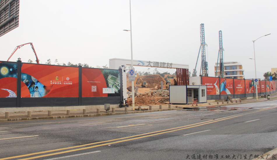 此工地施工工程采用了深圳市大通建材有限公司生產批發的施工現標準工地大門+A類烤漆鋼結構裝配式圍擋+圍擋節能燈+圍擋基礎等產品