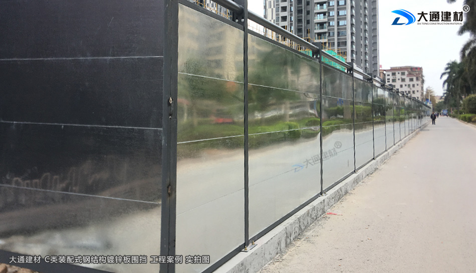 東莞建設工程項目選用深圳市大通建材有限公司生產批發的鋼結構圍擋C類,裝配式圍擋安裝方便,鍍鋅鋼板2.4米高符合工地施工圍擋要求標準