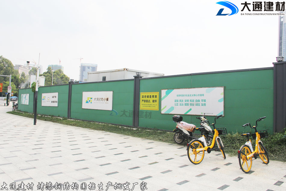 深圳市大通建材推出新型圍擋-綠色烤漆鋼結(jié)構(gòu)圍擋A款,其中的綠色烤漆墻面是一種看起來(lái)非常舒服、很有活力的顏色,簡(jiǎn)潔大方、美觀環(huán)保 抗風(fēng)力強(qiáng)、安全穩(wěn)固,適合各種施工工程選用。