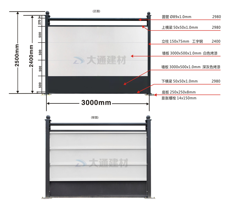 大通建材C類裝配式鋼結構圍擋烤漆款這兩款的烤漆鋼板厚度都是1.0mm,都是采用工字鋼立柱,同時每一擋圍擋的長度都是3米,但不同款式的圍擋高度卻有些不一樣喔,而C類圍擋常用款的圍擋高度通常是2.5m/2.4m,具體請參照上述展示的圍擋參數圖。