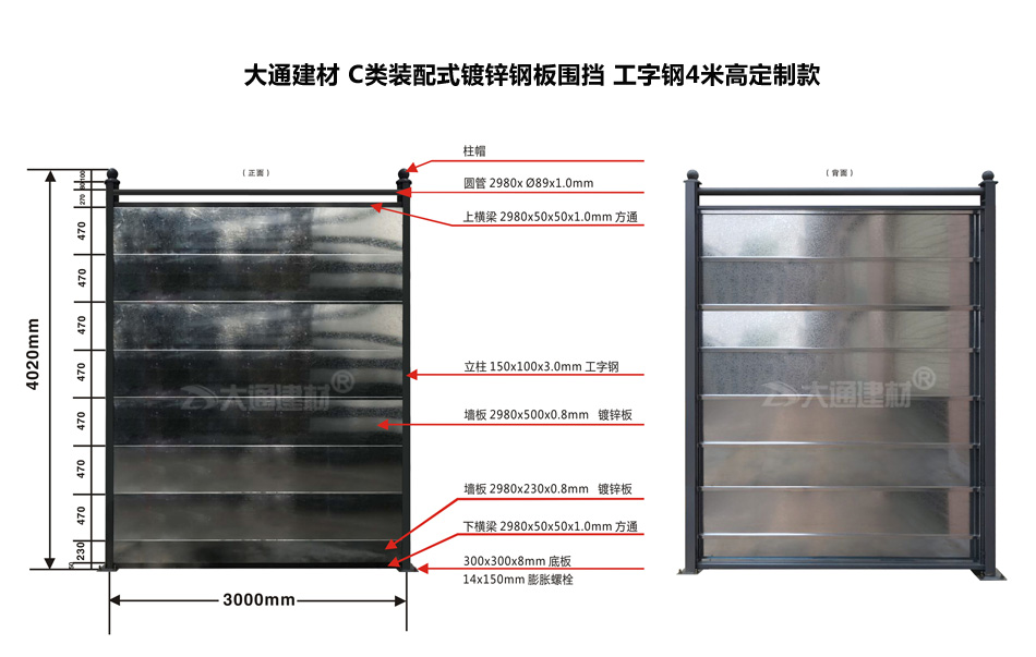 深圳市大通建材 C類鍍鋅鋼板圍擋-裝配式圍擋工字鋼4米高定制款 產品特點: