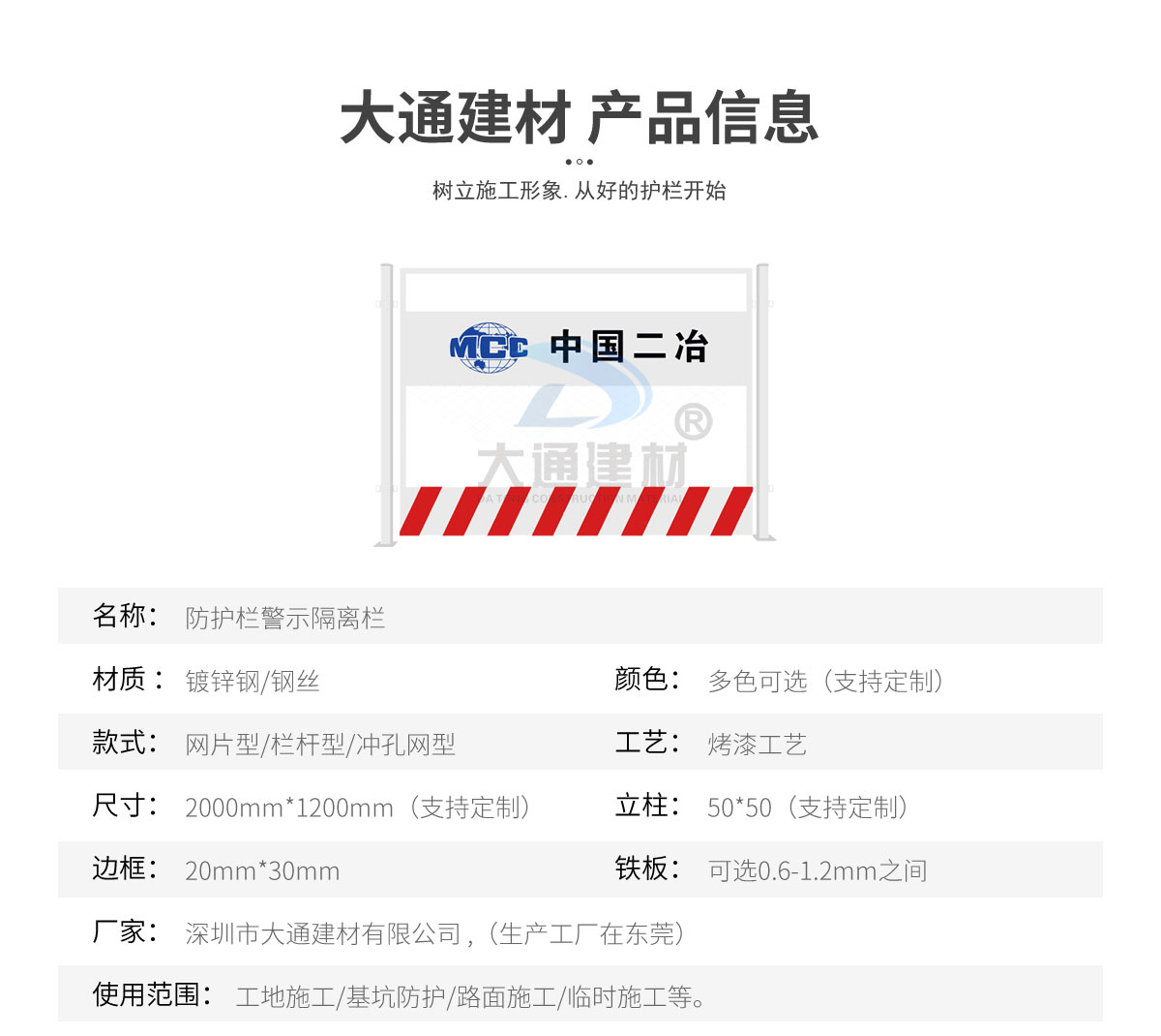 深圳市大通建材有限公司是一家集研發、生產、安裝、服務于一體的綜合性圍擋廠家,公司主營產品鋼圍擋、鋼結構圍擋、PVC圍擋、施工圍擋、市政圍擋、工地圍擋、烤漆鋼圍擋,官網:http://m.szjfj.cn/ ,銷售熱線:138 2656 2448