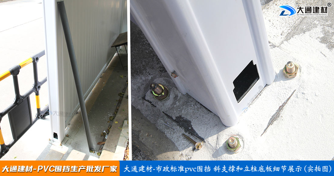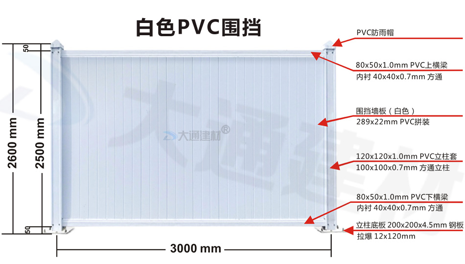 深圳市大通建材生產(chǎn)批發(fā)PVC圍擋符合市政標(biāo)準(zhǔn),這款圍擋的圍墻板面采用PVC長條版拼接,立柱、橫管均為PVC材料,內(nèi)部均襯方通。立柱底板為鋼板,并加斜撐受力。大通建材常規(guī)款PVC圍擋尺寸長3mx高2.5m、長3mx高2.2m、長3mx高2.0m 其它PVC圍擋尺寸可按實(shí)際需要進(jìn)行定制生產(chǎn)。